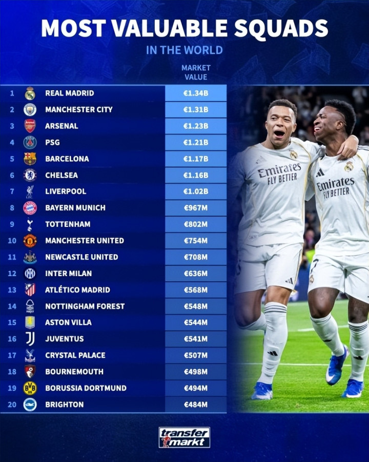 德国转会阛阓公布了新一期的俱乐部身价情况,皇马以13.4亿欧居首,曼城以13.1亿欧次之,阿森纳则以12.3亿欧位居第三。