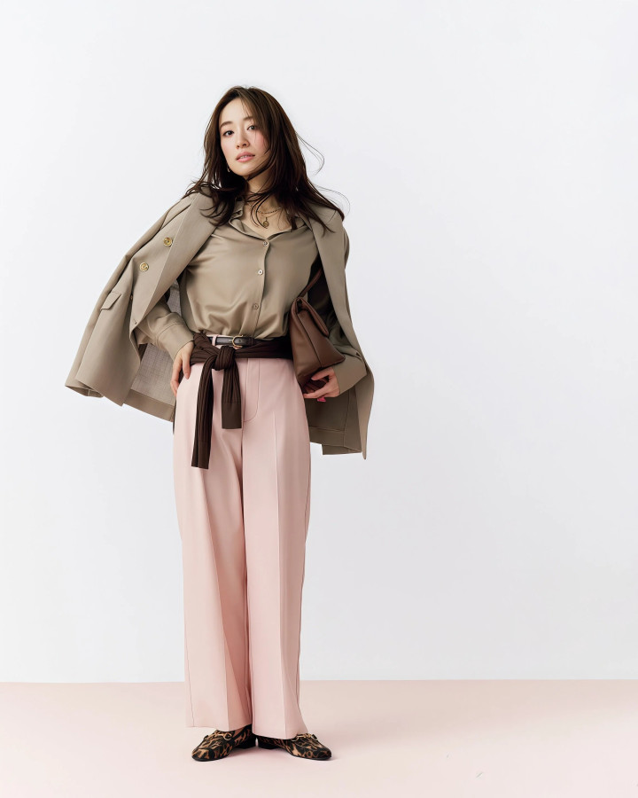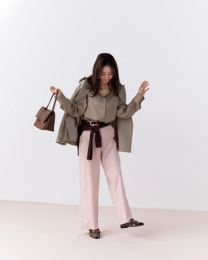 念念要在细节处完胜,就要扫视单品材质的碰撞,不同材质的碰撞,能让总计造型看起来更有端倪感,丝绸粉色衬衫配棉质棕色裤子,材质的对比,能让总计造型看起来更丰富,不会显得太平面。