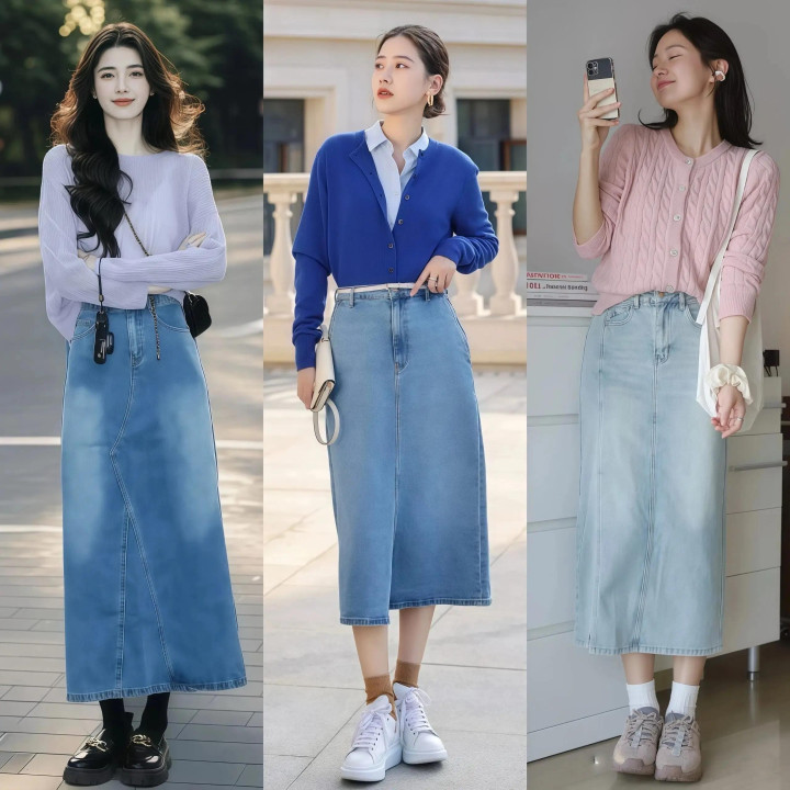 淡彩色真挚衫配一条牛仔长裙,这组搭配的韩系滋味十分足,浅蓝配淡色牛仔裙、粉色配中蓝牛仔裙王人顺眼,时势柔软带着少许悠闲的滋味,脚上踩白色畅通鞋概况乐福鞋,春天出街穿这一套回头率很高。